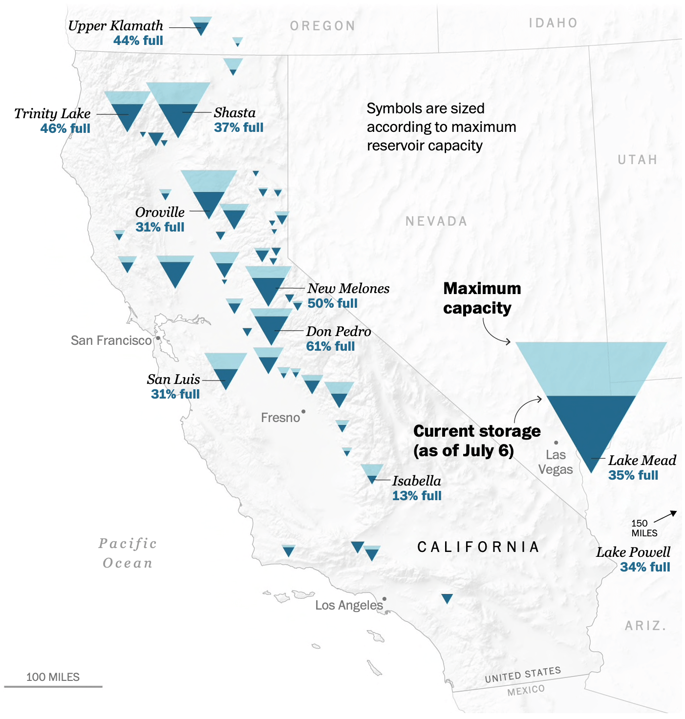 To show water levels in California’s drying reservoirs, The Washington Post used upside down triangles to represent each reservoir.